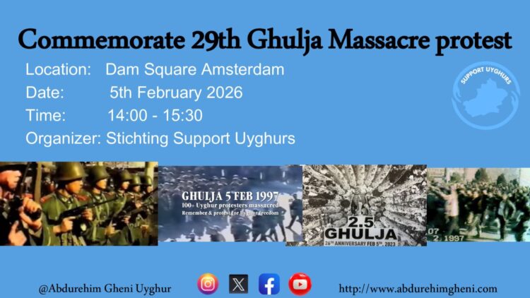 Dam Square, Amsterdam Dam, Amsterdam, Noord-Holland, NetherlandsThe Ghulja massacre on February 5, 1997 in East Turkestan, resulted from Uyghur discontent, expressed through peaceful demonstrations against religious repression, economic disparities, and discrimination… But hundreds of peaceful Uyghur protesters were killed, and thousands were arrested, and disappeared by the Chinese Communist Party regime… For more information, please read this article. We Uyghurs never …